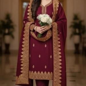 Sozni Work Ladies Woollen Pheran with Stole in Maroon Color
