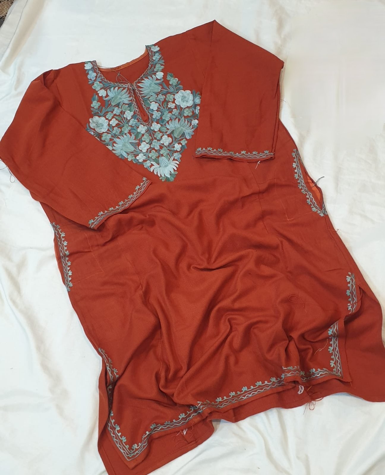 Embrace Kashmiri tradition with this elegant Aari work pheran crafted in soft cashmilon fabric. Lightweight yet warm, this pheran is perfect for chilly winters while keeping you stylish and comfortable. The intricate Aari embroidery featuring traditional Kashmiri motifs adds a touch of timeless grace, making it suitable for daily wear as well as festive occasions.