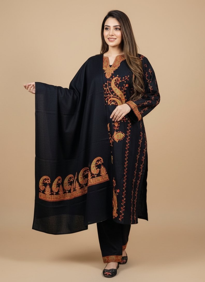 Elevate your winter style with this beautifully crafted Poly Wool 3-piece suit featuring intricate Sozni patch work for a touch of Kashmiri elegance. Designed for comfort and grace, this set offers a perfect blend of warmth, softness, and style — ideal for both casual and festive wear.