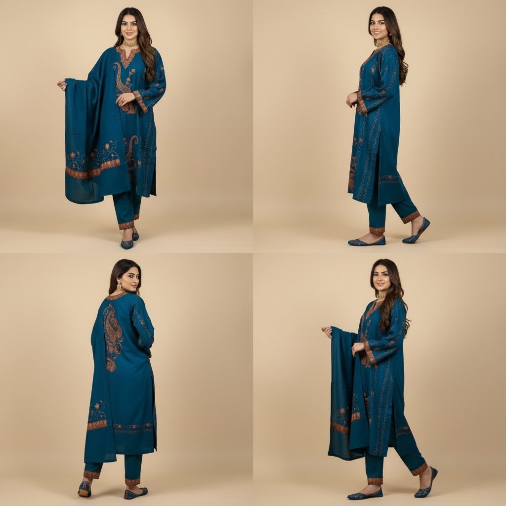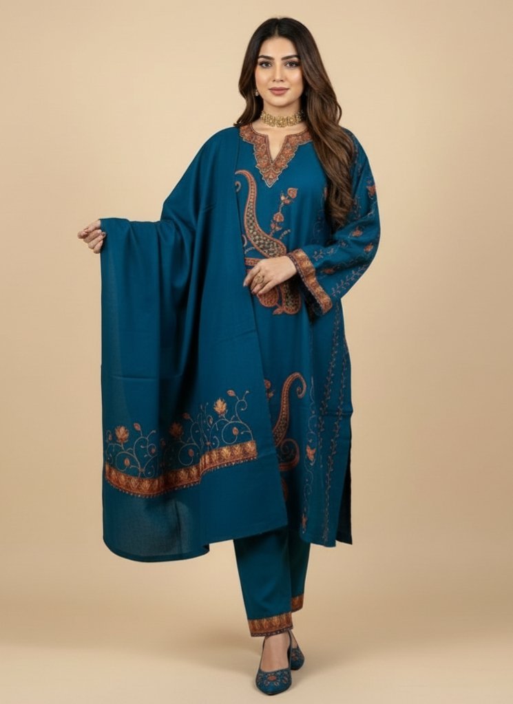 Elevate your winter style with this beautifully crafted Poly Wool 3-piece suit featuring intricate Sozni patch work for a touch of Kashmiri elegance. Designed for comfort and grace, this set offers a perfect blend of warmth, softness, and style — ideal for both casual and festive wear.