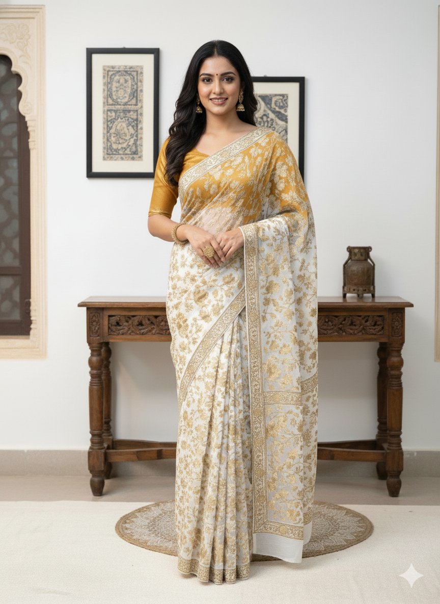 - Crafted from premium semi-georgette fabric, known for its lightweight, breathable texture and slightly sheer elegance.