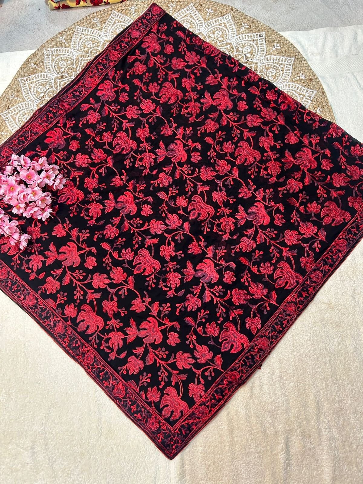 - Features traditional Kashmiri hand embroidery, showcasing intricate floral patterns and motifs.