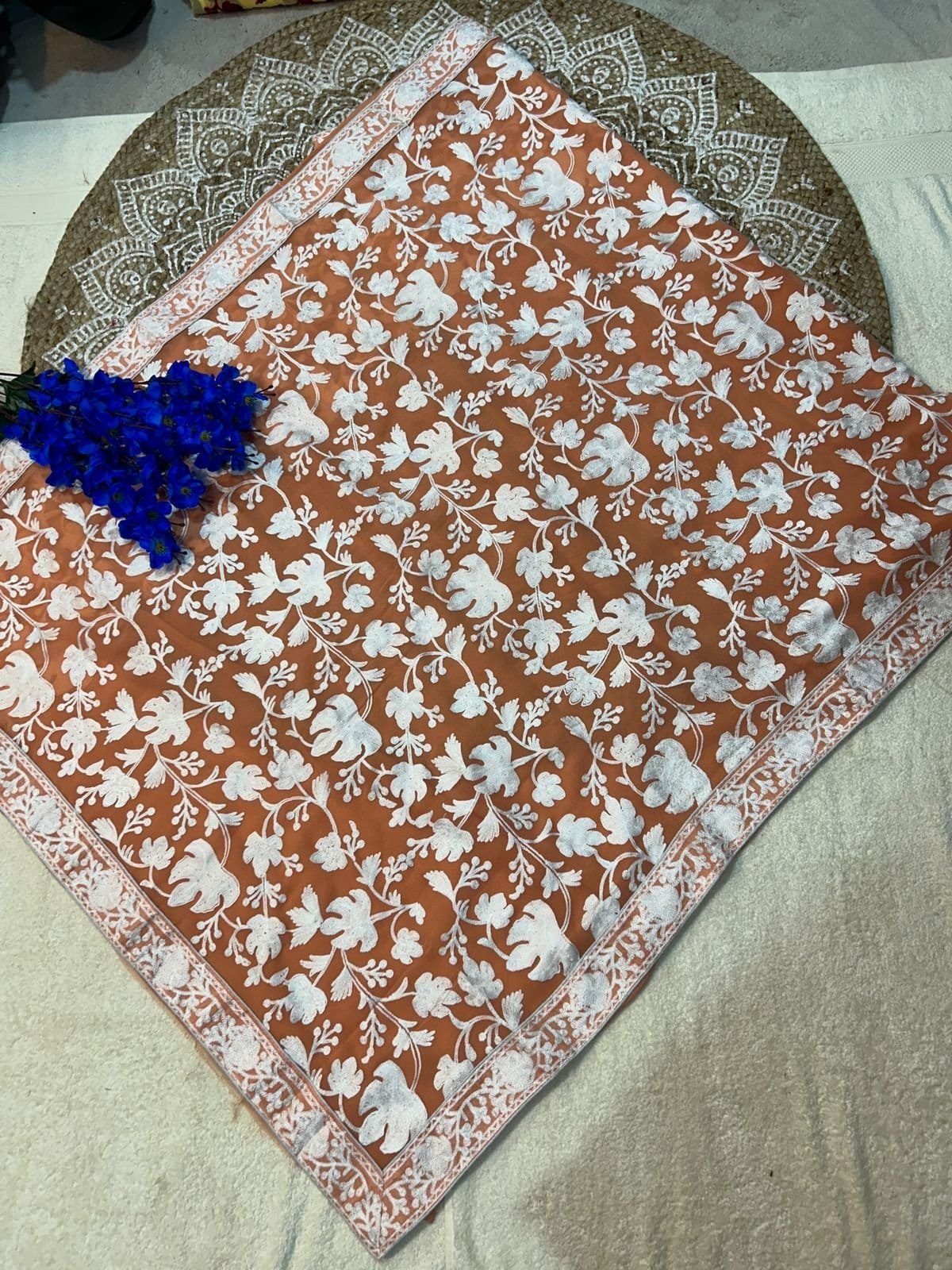 - Handcrafted by skilled Kashmiri artisans, each saree is a masterpiece that reflects the cultural heritage and artistry of the region.