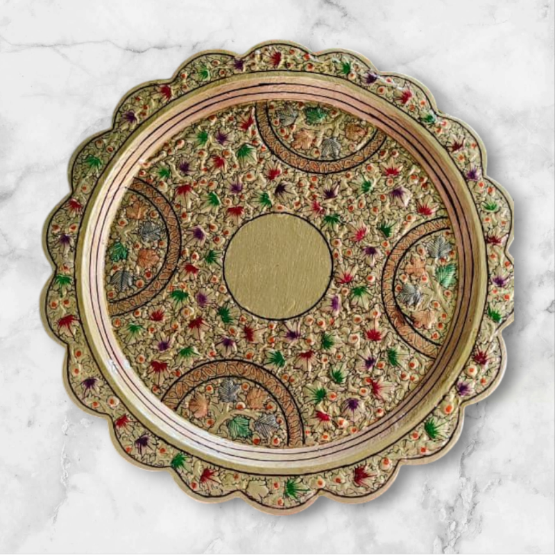 This 20-inch Papier Mâché panel is a masterpiece of traditional Kashmiri craftsmanship. Each piece is handcrafted using age-old techniques, starting with a base made from recycled paper pulp, then carefully shaped, dried, and coated for durability. The surface is hand-painted in vibrant colors and finished with delicate gold detailing, showcasing the unmatched finesse of Kashmiri artisans.