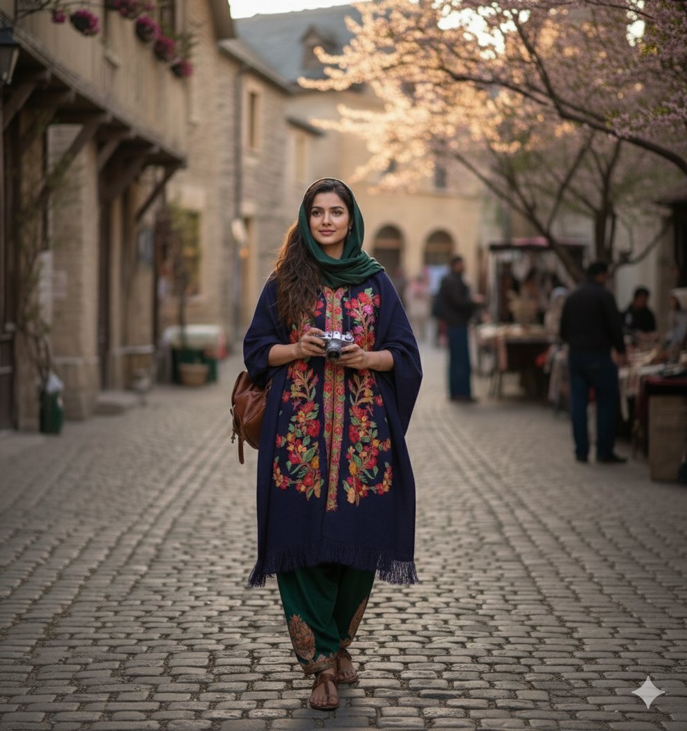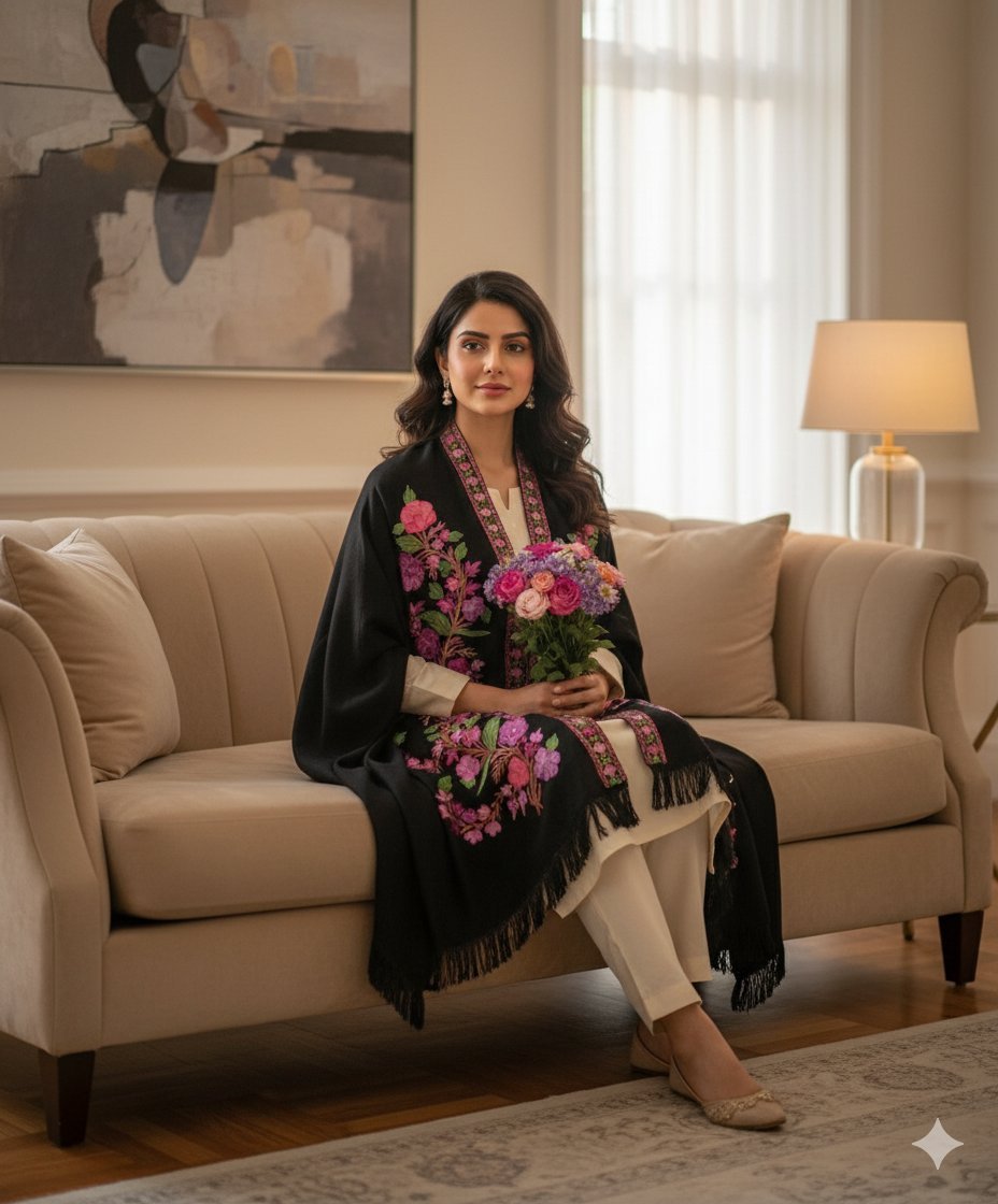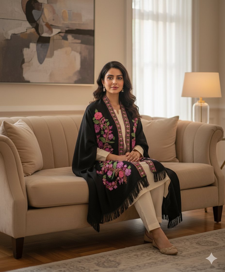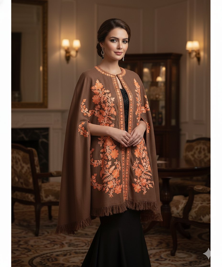 Wrap yourself in timeless Kashmiri elegance with our exquisite Woollen Cape Shawl, a perfect blend of tradition, craftsmanship, and modern grace. Handcrafted by skilled Kashmiri artisans, this luxurious shawl features intricate Ari embroidery—a delicate needlework technique known for its fine chain stitches and detailed floral motifs inspired by the breathtaking beauty of Kashmir’s gardens.