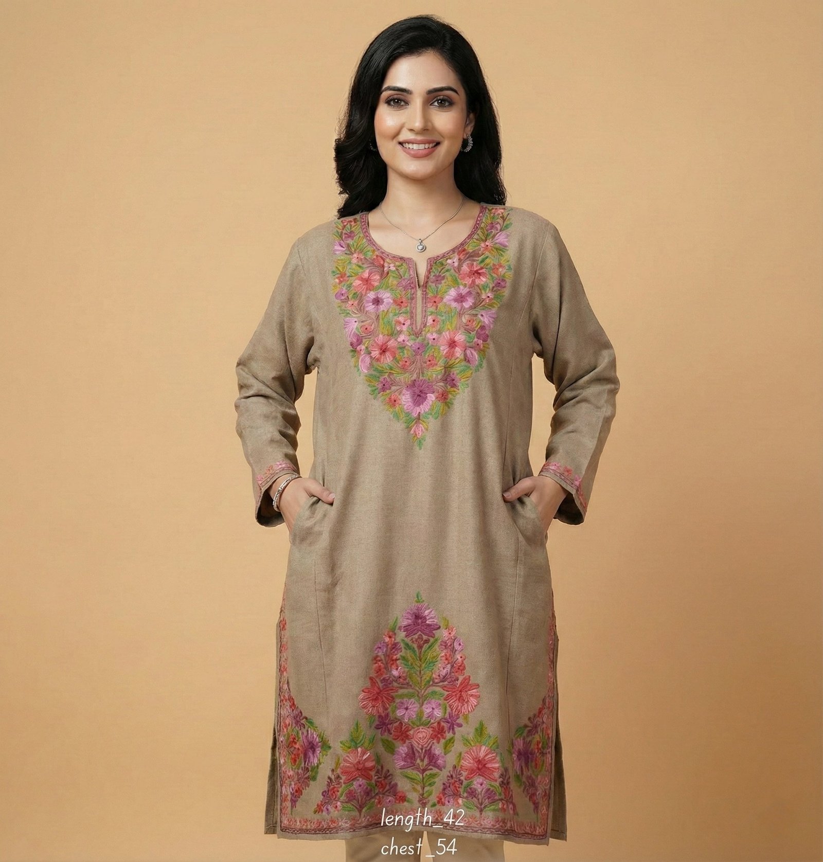 Elevate your winter elegance with this beautifully crafted designer Ari work pheran, made for those who appreciate timeless Kashmiri artistry. Crafted from premium 48-count fabric, this pheran offers warmth, comfort, and a graceful drape.