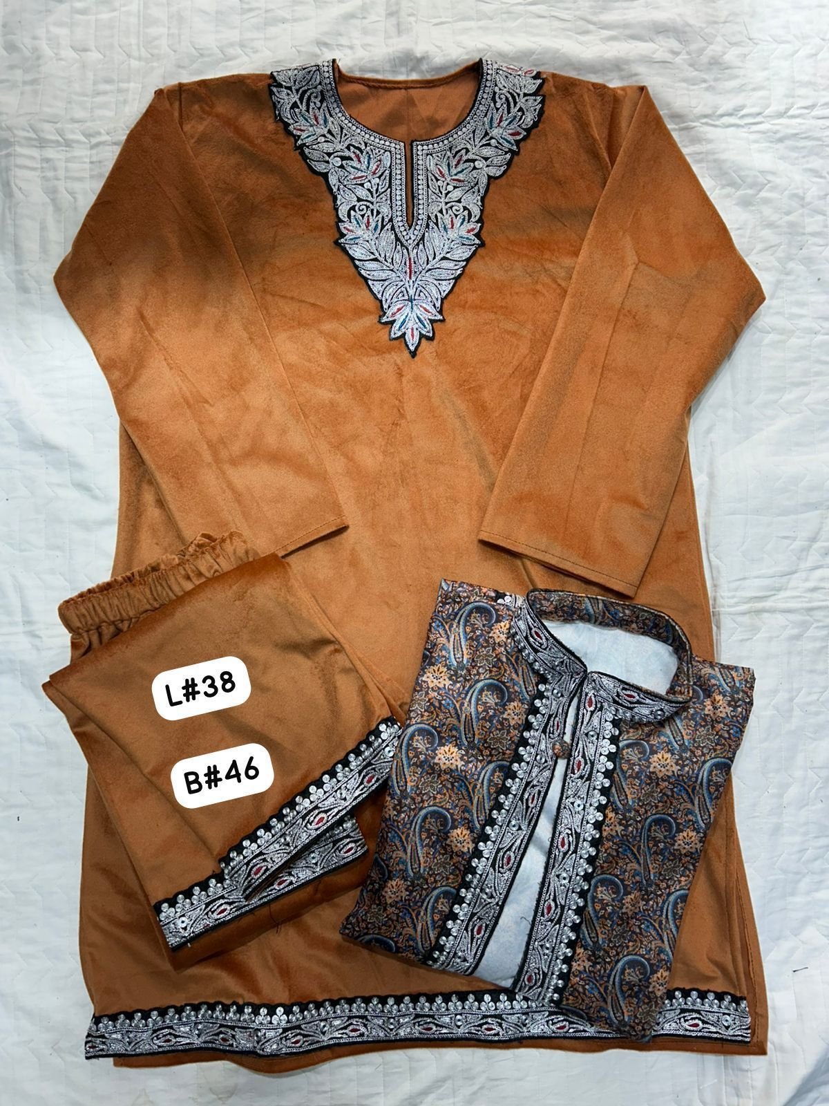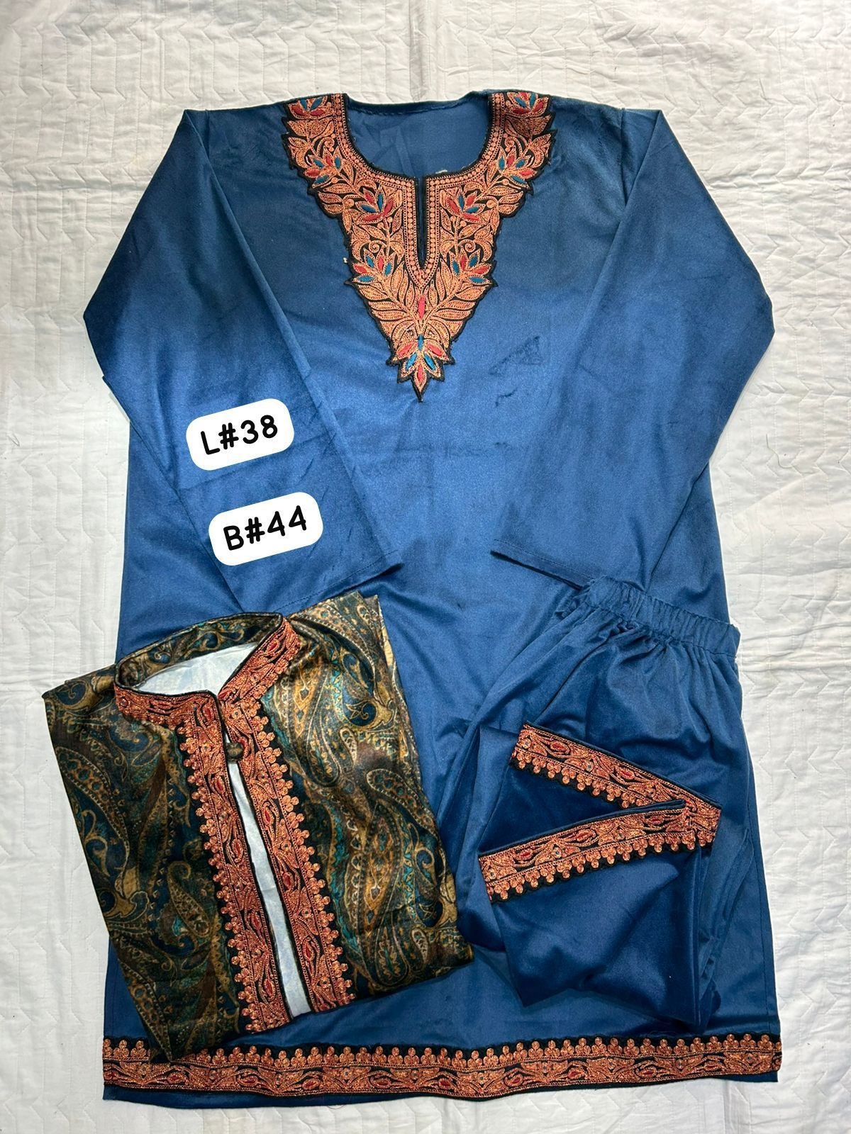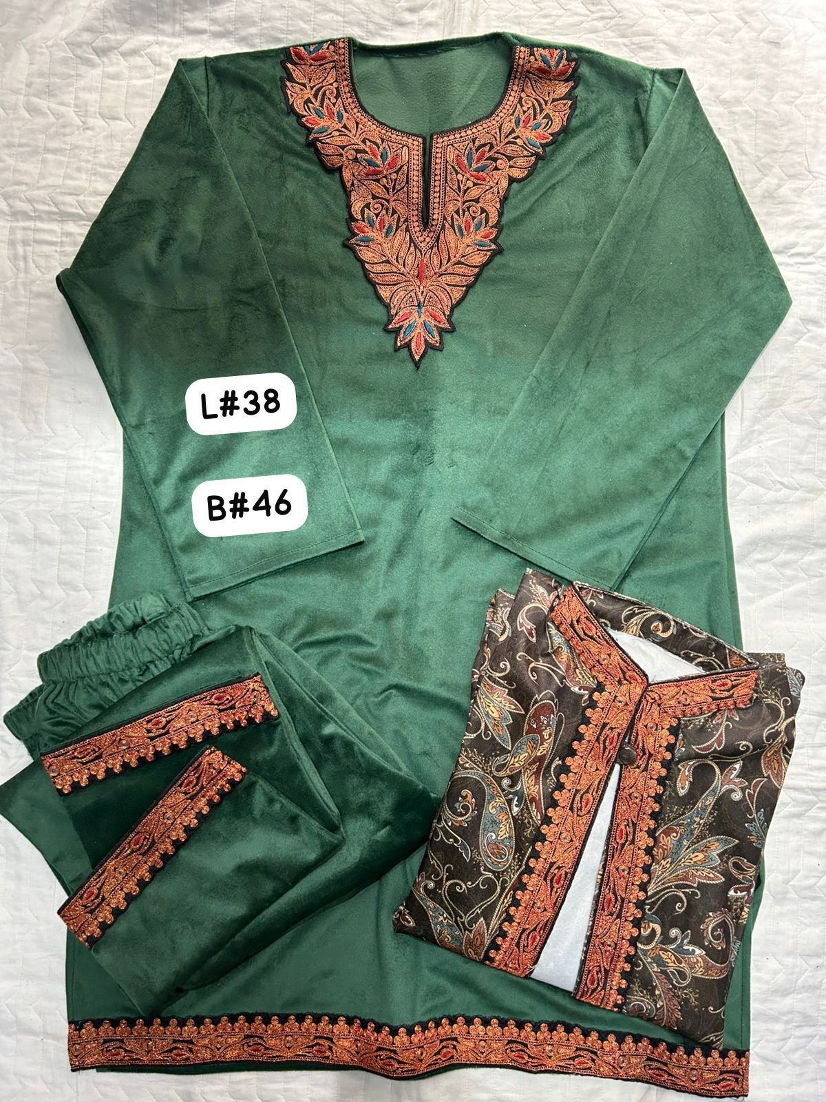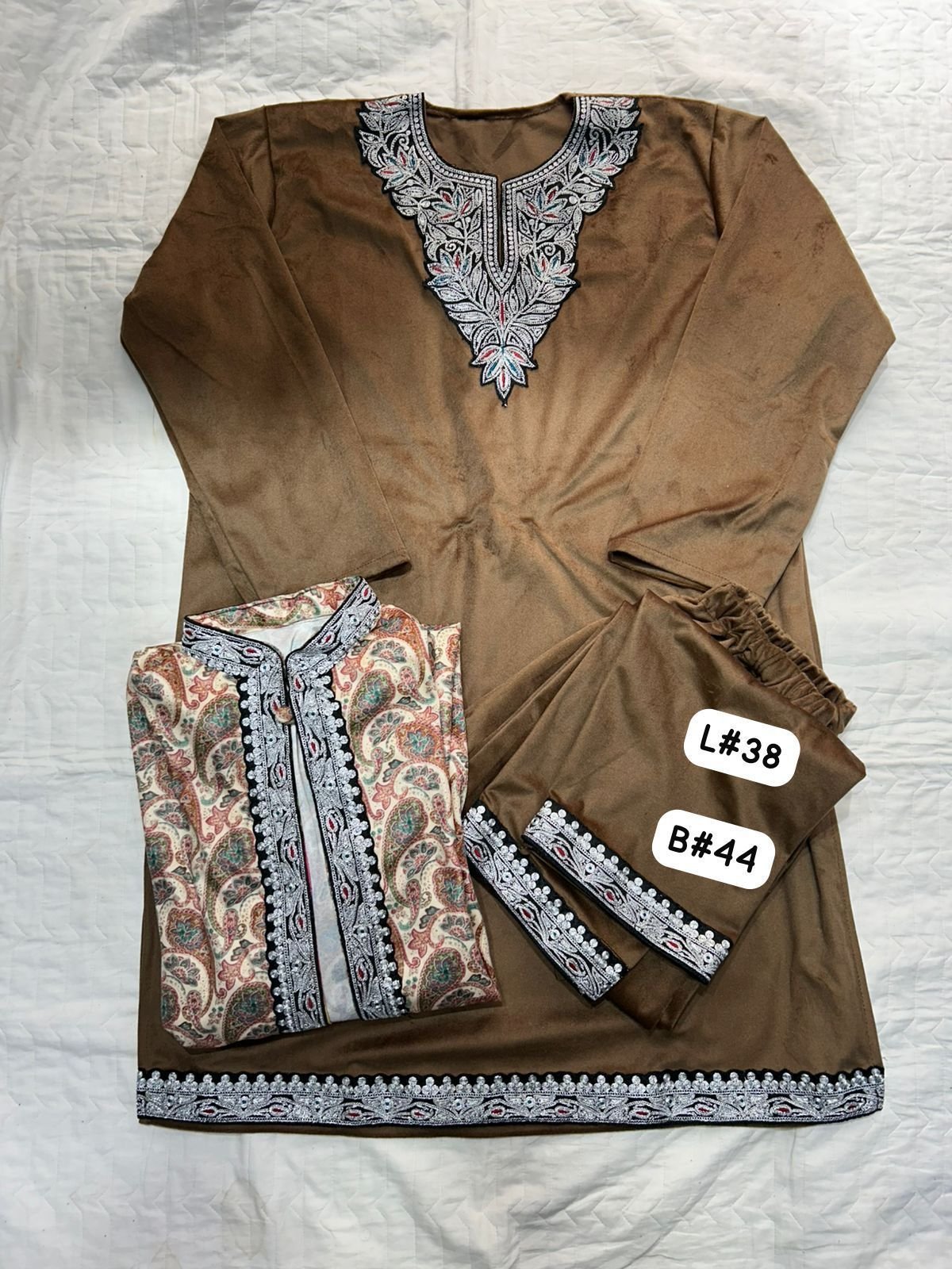 Step into elegance and comfort with this stunning Velvet Cord Set, beautifully enhanced with Tilla work patch detailing and paired with a luxurious velvet Kani print shrug. Designed to blend Kashmiri heritage with modern fashion, this outfit exudes sophistication, making it perfect for festive occasions, parties, or elegant casual wear.