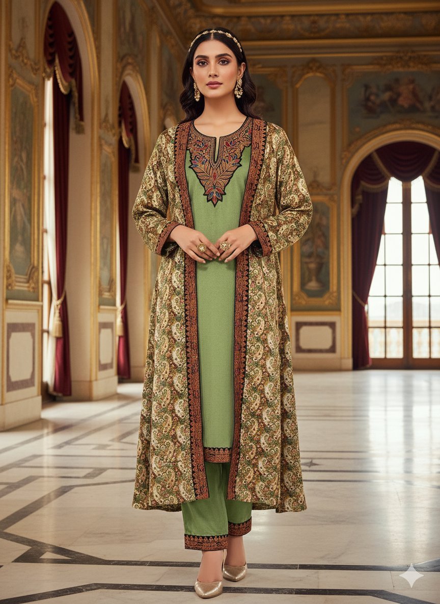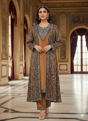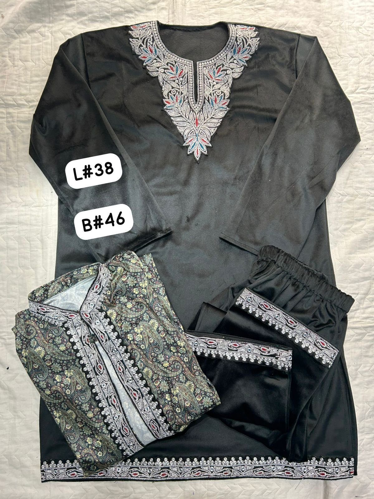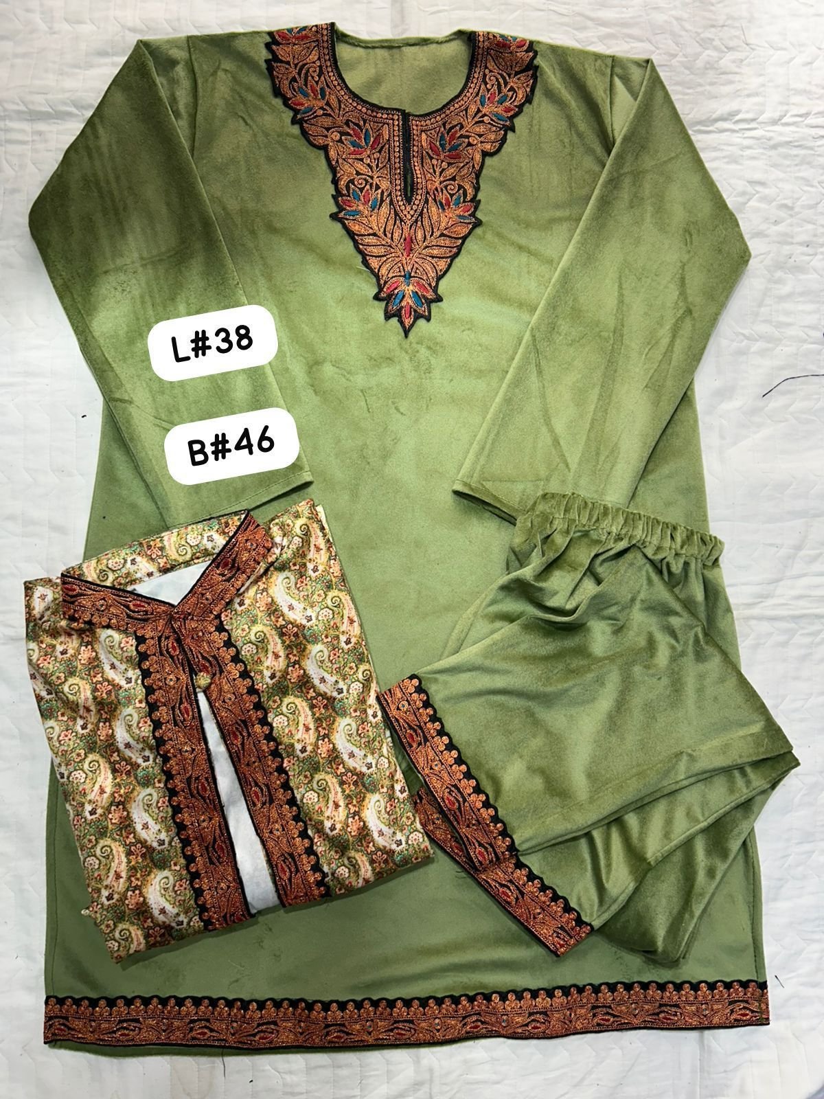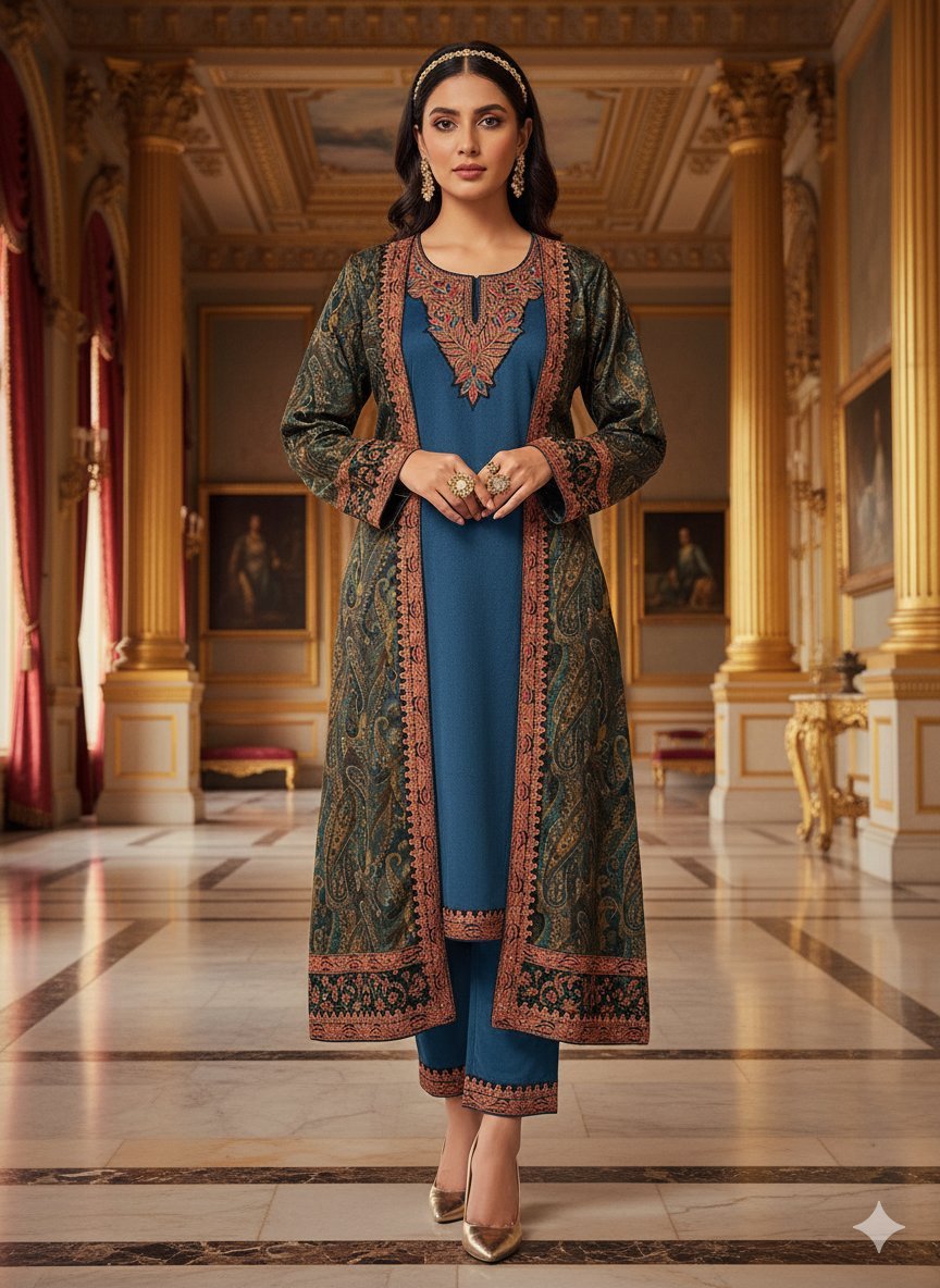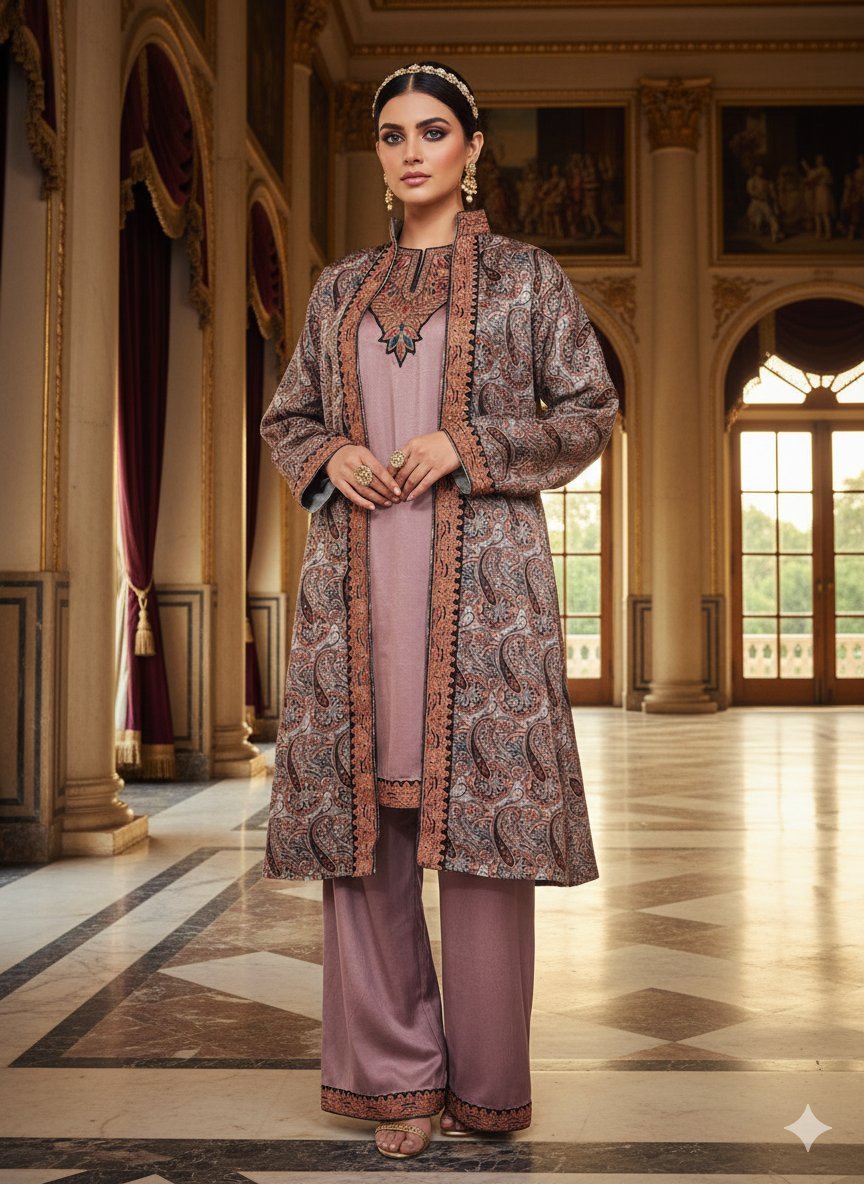 Step into elegance and comfort with this stunning Velvet Cord Set, beautifully enhanced with Tilla work patch detailing and paired with a luxurious velvet Kani print shrug. Designed to blend Kashmiri heritage with modern fashion, this outfit exudes sophistication, making it perfect for festive occasions, parties, or elegant casual wear.